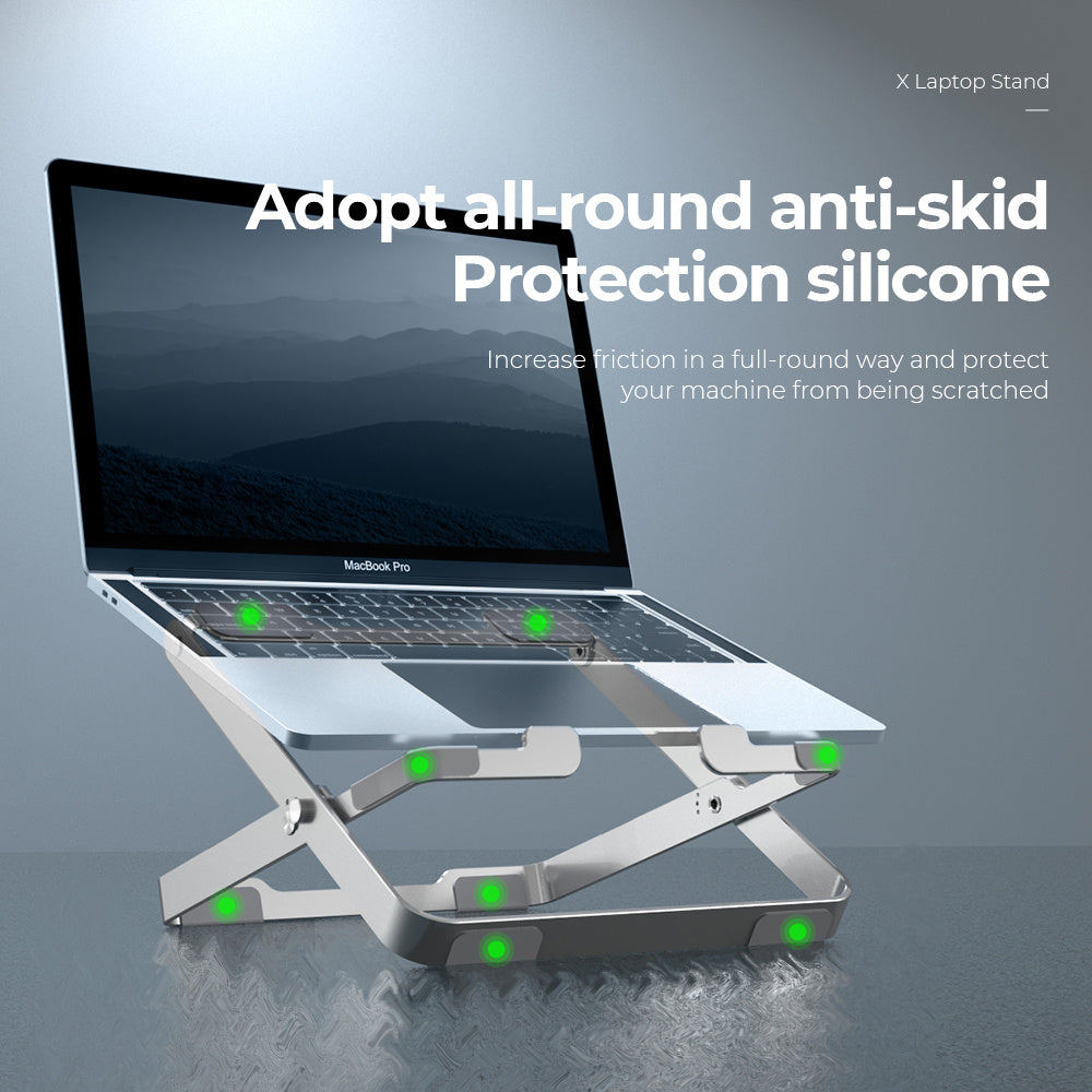 Składany stojak na laptopy i tablety wykonany z aluminium i silikonu. Regulowana wysokość pozwala na dopasowanie kąta nachylenia podczas pracy. Antypoślizgowe elementy poprawiają stabilność. Konstrukcja wspiera chłodzenie urządzenia.