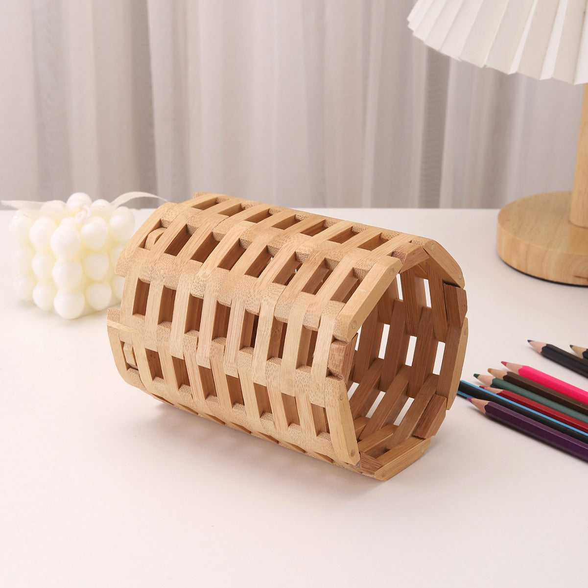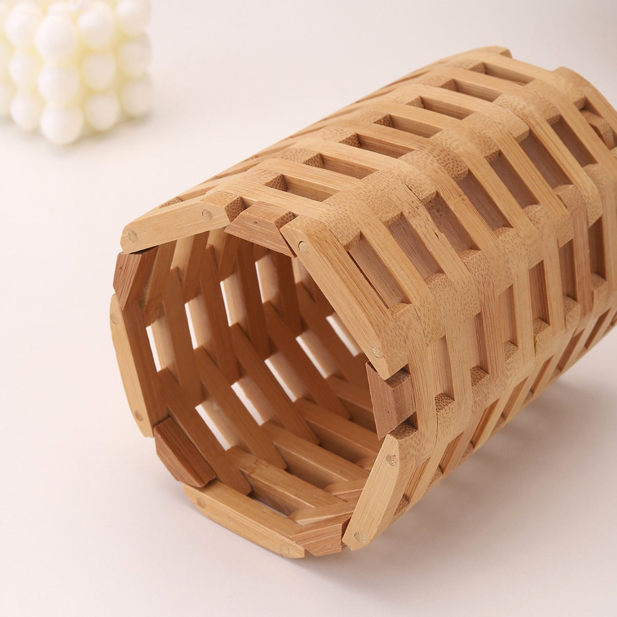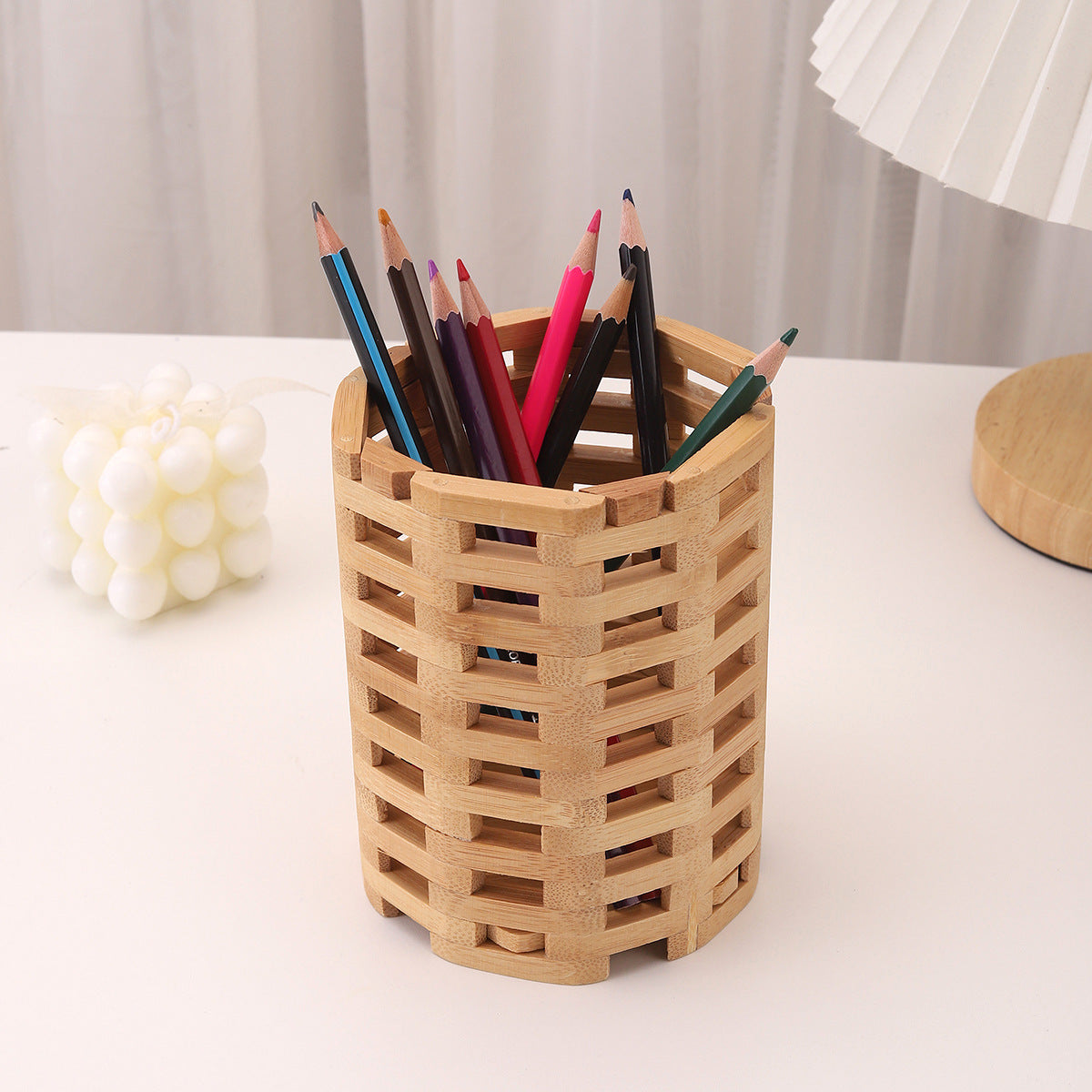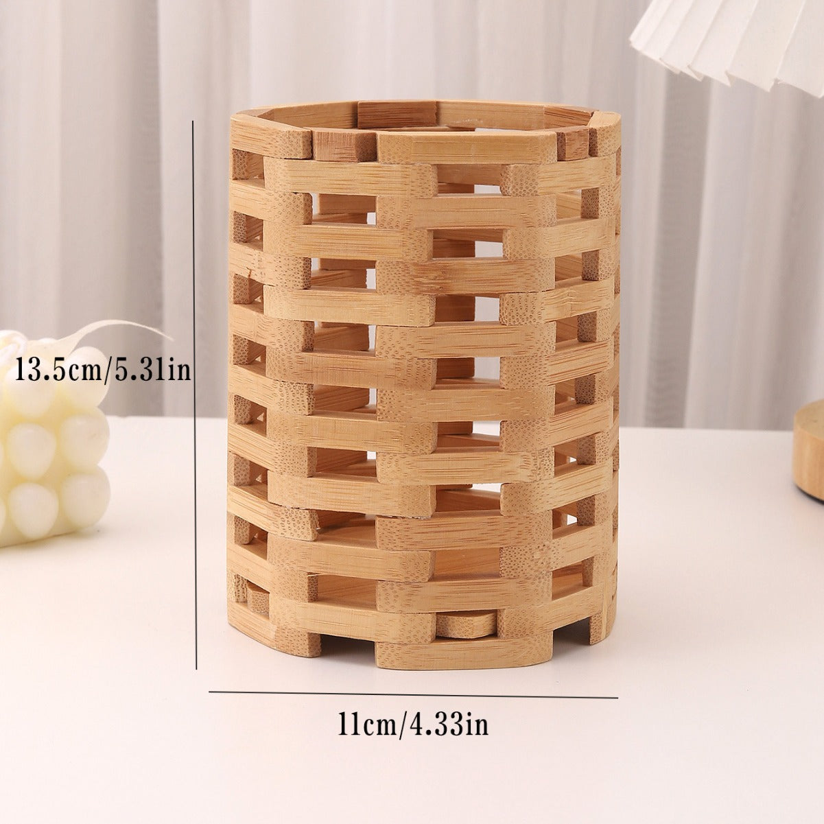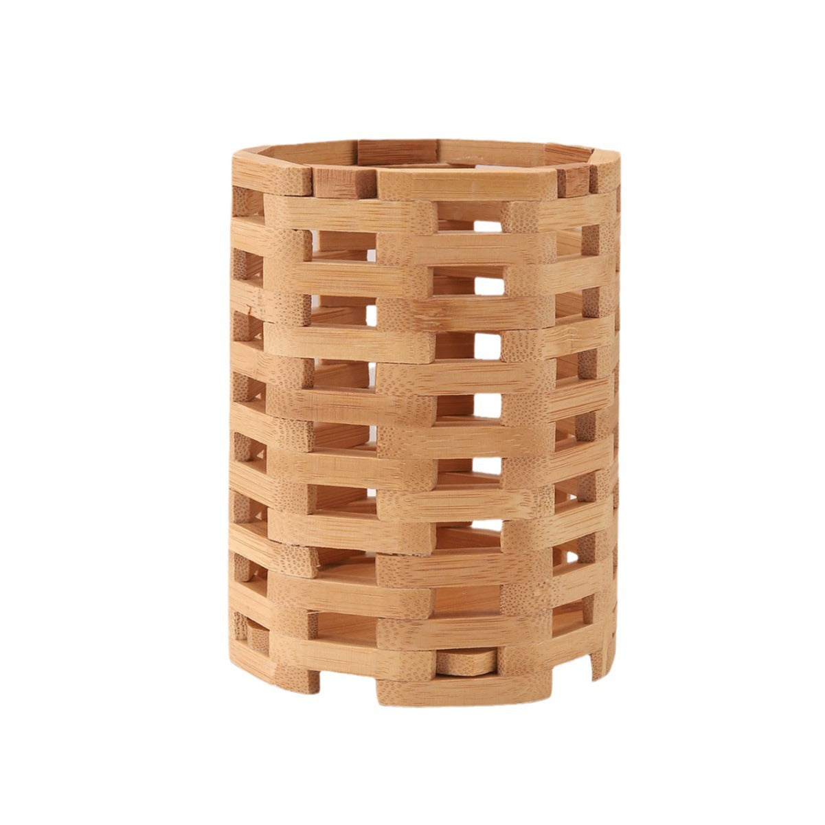 Stojak wykonany z naturalnego bambusa w stylu nowoczesnym to funkcjonalny organizer do biurka, kuchni lub łazienki. Nadaje się do przechowywania długopisów, pędzli, pałeczek lub innych drobnych akcesoriów. Prosty kształt i wentylowany wzór zapewniają stabilność i wygodne użytkowanie.