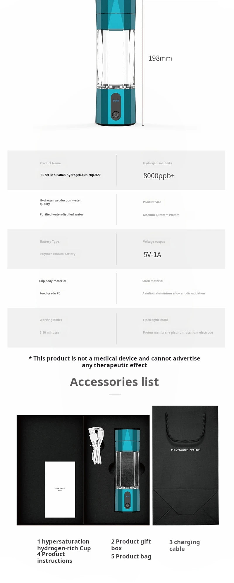 Butelka do wody wodorowej z technologią elektrolizy i filtracją. Urządzenie wzbogaca wodę w cząsteczki wodoru i zapewnia wygodę codziennego użytkowania. Kompaktowy format sprawia, że butelka sprawdza się zarówno w domu, jak i poza nim.