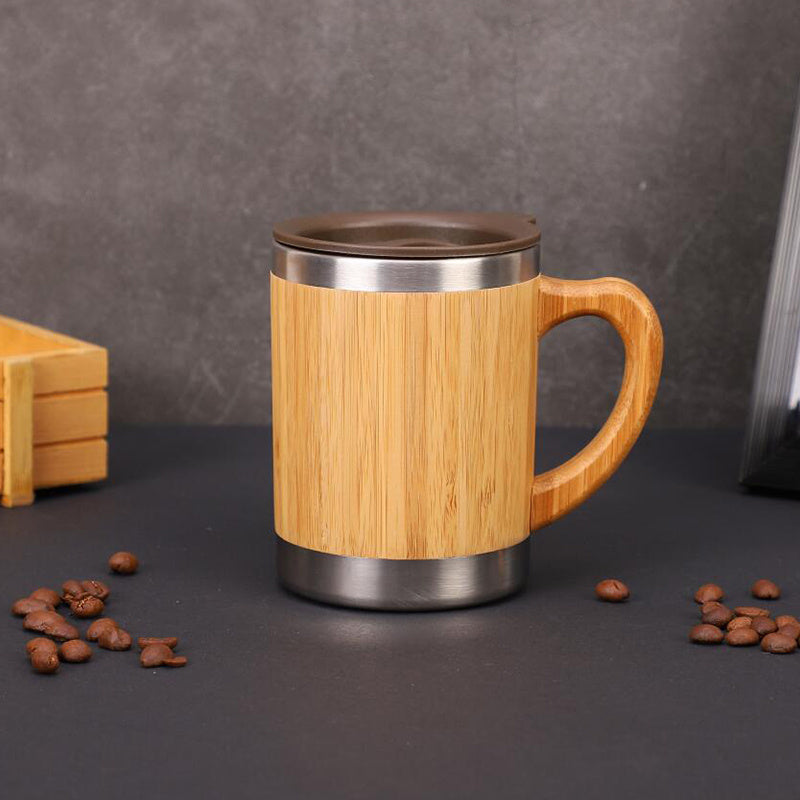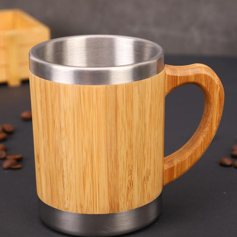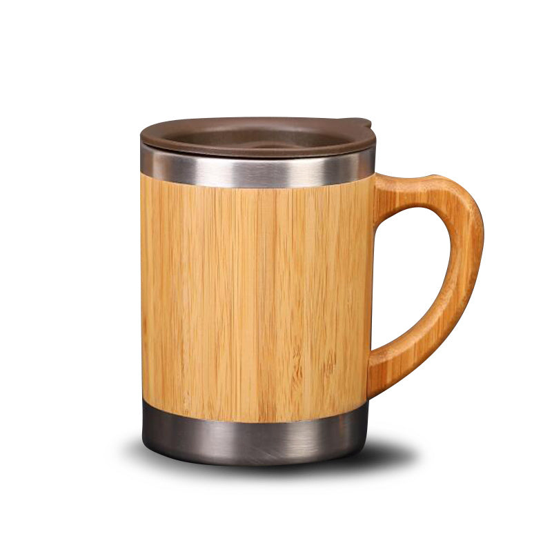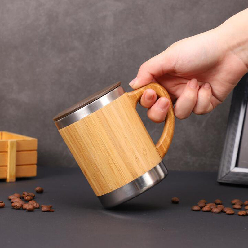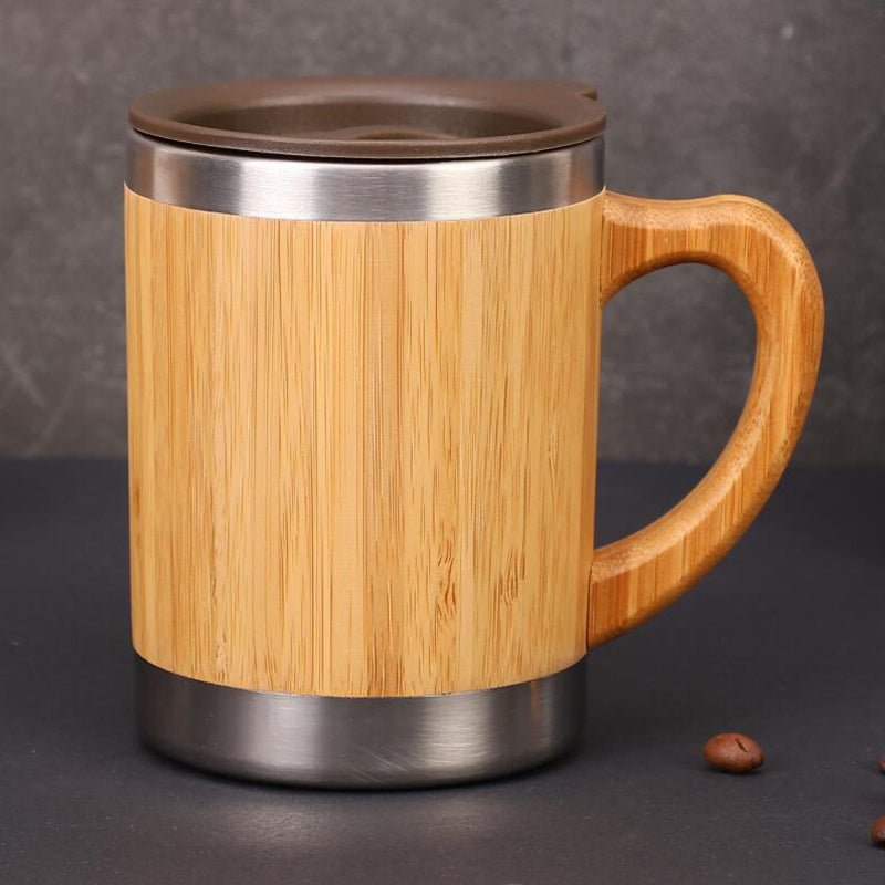 Kubek z obudową z naturalnego bambusa i uchwytem. Posiada wewnętrzne wykończenie ze stali nierdzewnej. Przeznaczony do codziennego użytku w domu, biurze lub w podróży. Forma i materiały wykonania pasują do prostych i nowoczesnych wnętrz.