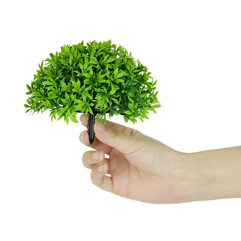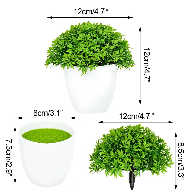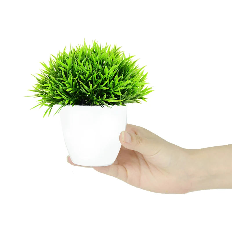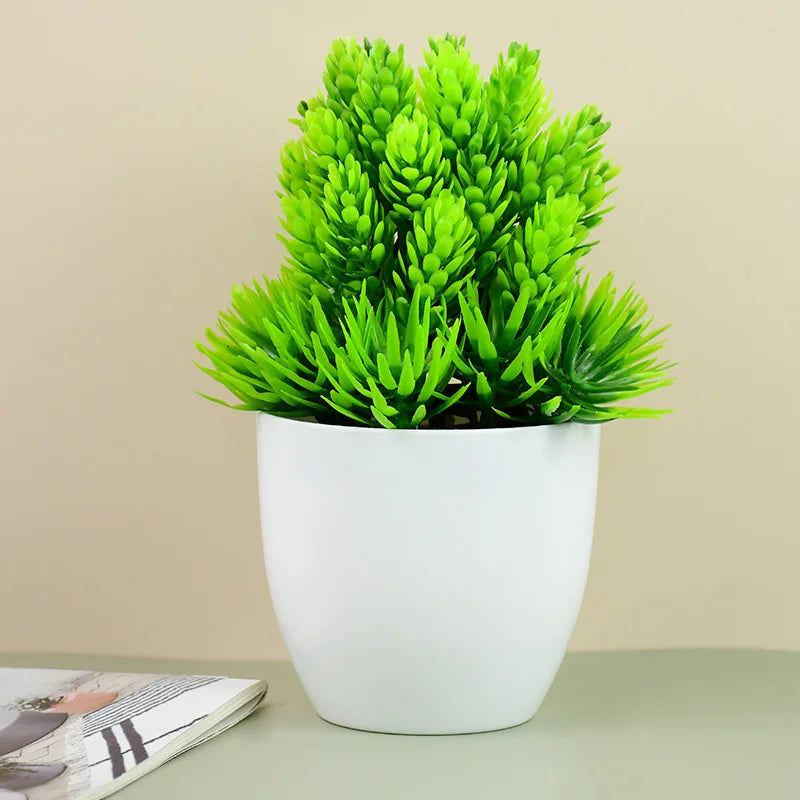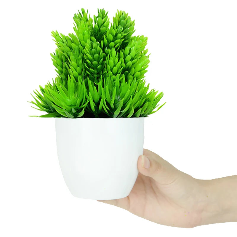 Sztuczna roślina typu bonsai w kolorze zielonym, umieszczona w doniczce dekoracyjnej. Przeznaczona do użytku wewnętrznego – może zostać ustawiona na biurku, regale lub w poczekalni. Produkt wykonany z tworzywa sztucznego. Nie wymaga podlewania ani pielęgnacji.