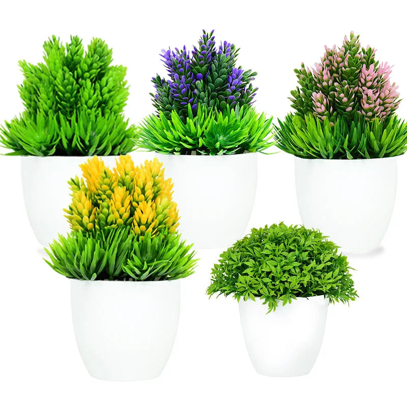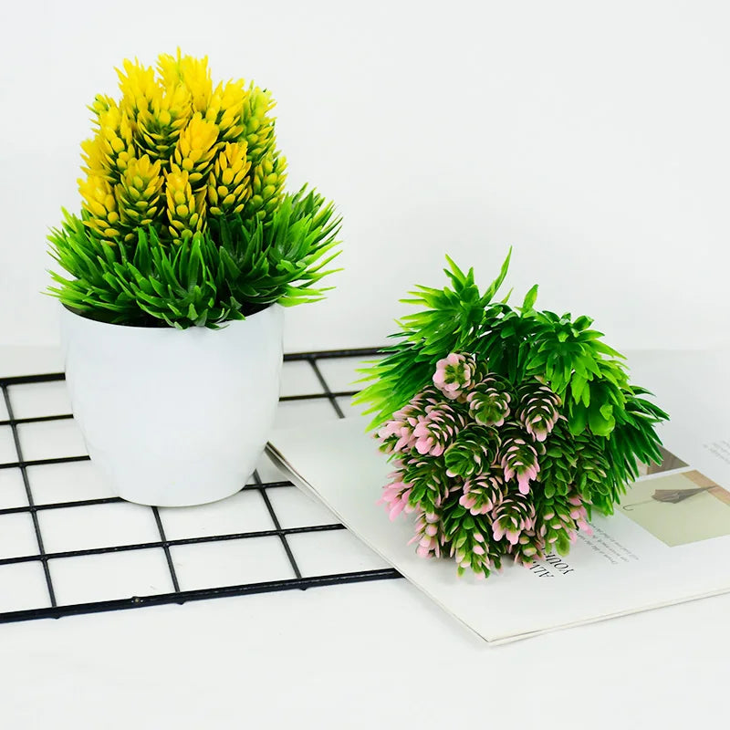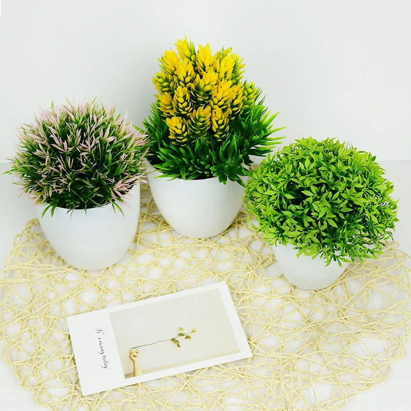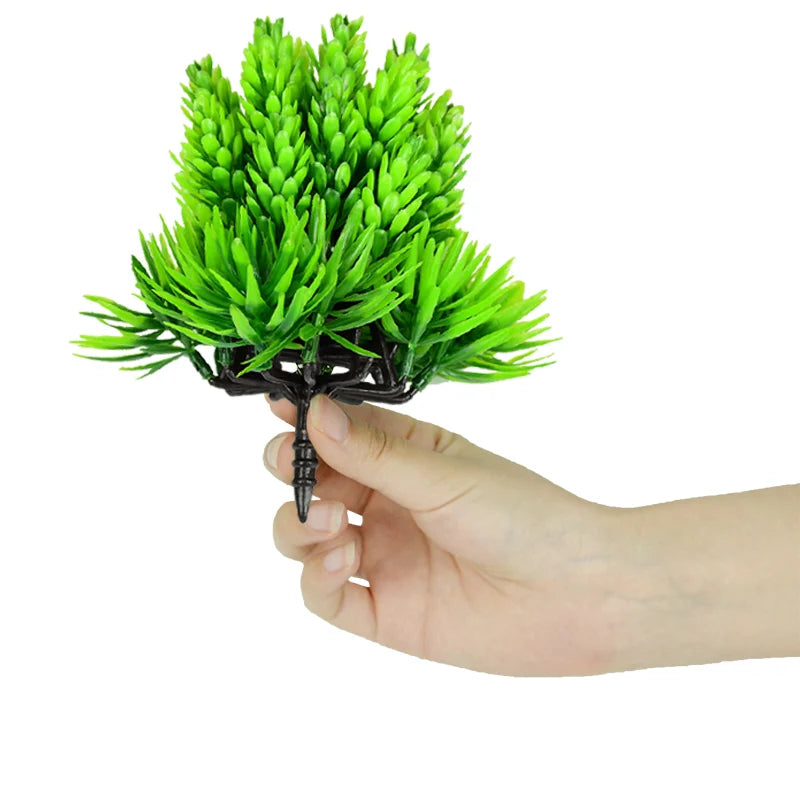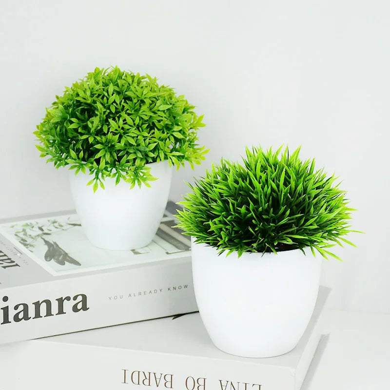 Sztuczna roślina typu bonsai w kolorze zielonym, umieszczona w doniczce dekoracyjnej. Przeznaczona do użytku wewnętrznego – może zostać ustawiona na biurku, regale lub w poczekalni. Produkt wykonany z tworzywa sztucznego. Nie wymaga podlewania ani pielęgnacji.