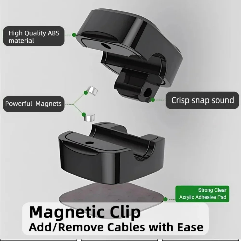 Magnetyczne klipsy do kabli z silnym magnesem utrzymują przewody w jednym miejscu, zapobiegając ich splątaniu. Pasują do kabli USB, myszy, słuchawek i ładowarek. Można je zamocować bez wiercenia. Dostępne w zestawie 3 lub 6 sztuk.