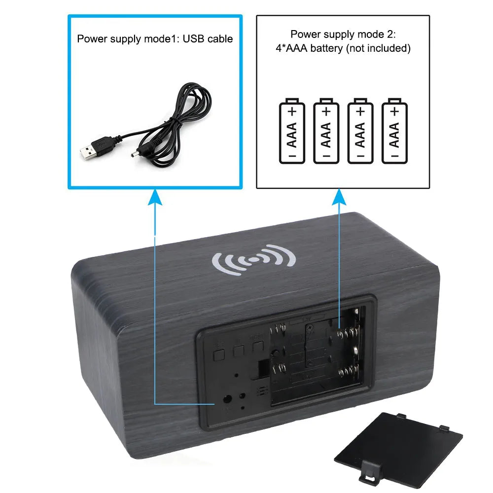 Drewniany Zegar LED z Ładowarką Bezprzewodową-Budzik,kalendarz,Termometr
