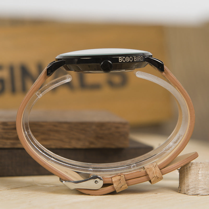Zegarek wykonany z połączenia naturalnego drewna, forniru bambusowego, bawełny i korka. To praktyczny dodatek, który łączy funkcjonalność z troską o środowisko i naturalne materiały.